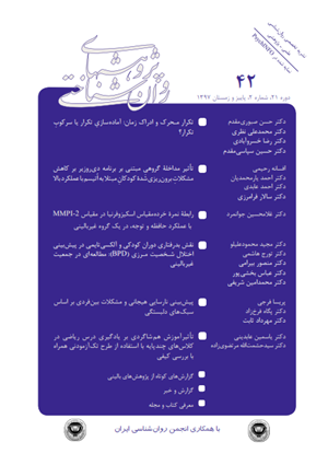 حسنی، جعفر (1386). رابطه عملکرد پوشش معکوس بینایی با علائم مثبت و منفی در بیماران مبتلا به اسکیزوفرنی. مجله پژوهشهای روان¬شناختی، (2،1)10، 48-29.